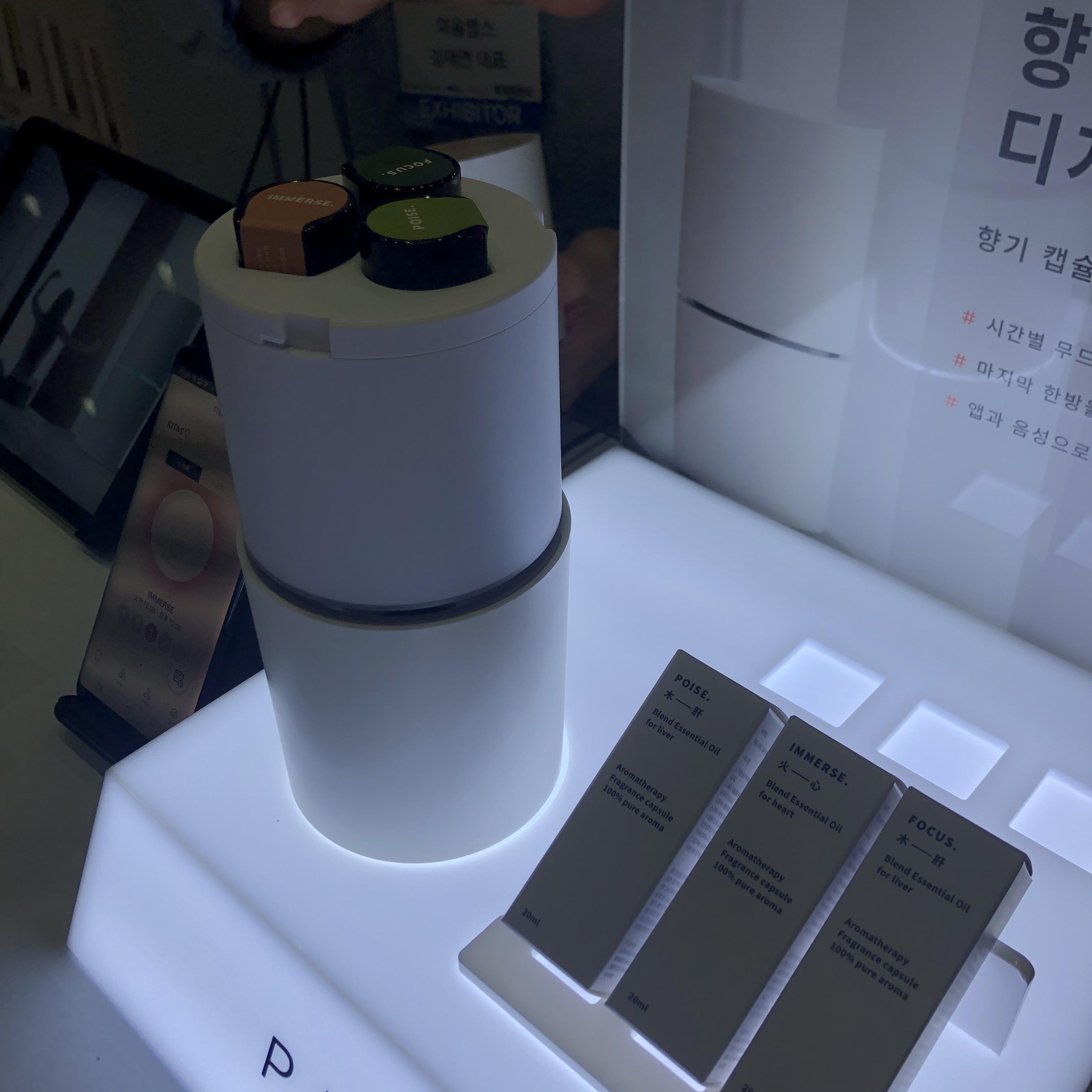 마지막으로 제일 갖고 싶었던 제품은 "스마트 디퓨저" 였는데요. 디퓨저에 향기 캡슐을 조합하여 향을 낼 수 있는 제품인데 향을 자기 취향대로 조합하면 나만의 향이 완성되는 신기한 제품이었어요. 그리고 스마트폰과 연동도 할 수 있어 언제 킬지 끌지도 스마트폰으로 조절할 수 있어요. 조향사가 직접 조합한 위 조합방식이 제일 냄새가 좋더라고요.